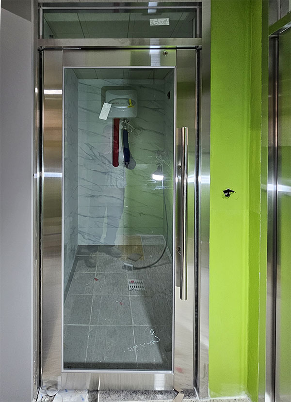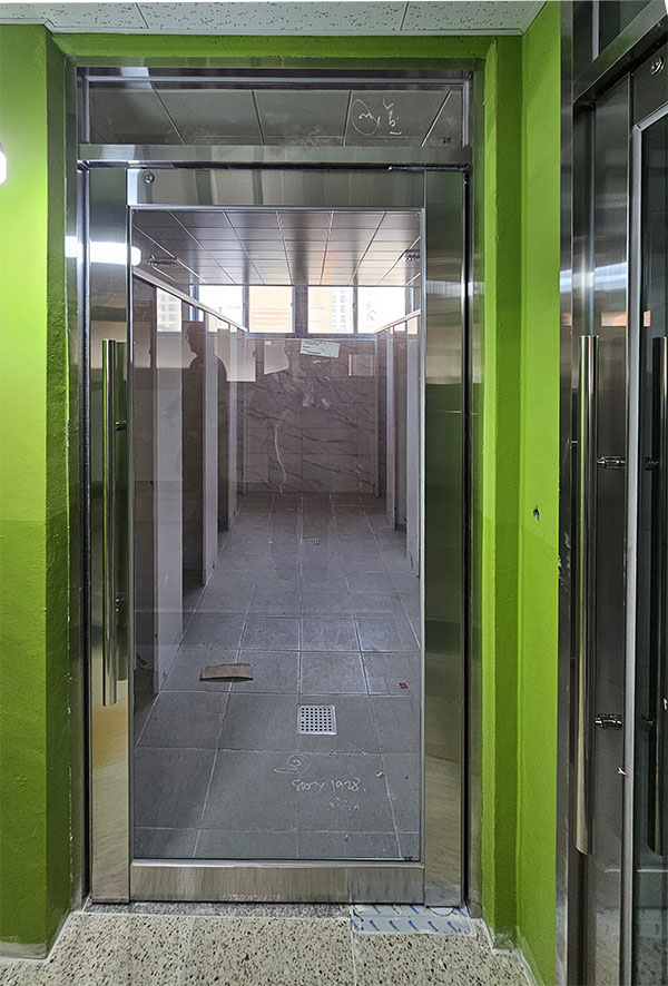 1단계 – 기존 도어 철거 및 프레임 설치 기존 화장실 출입문을 철거하고, 스테인리스 재질의 견고한 도어 프레임을 새롭게 시공하였습니다.