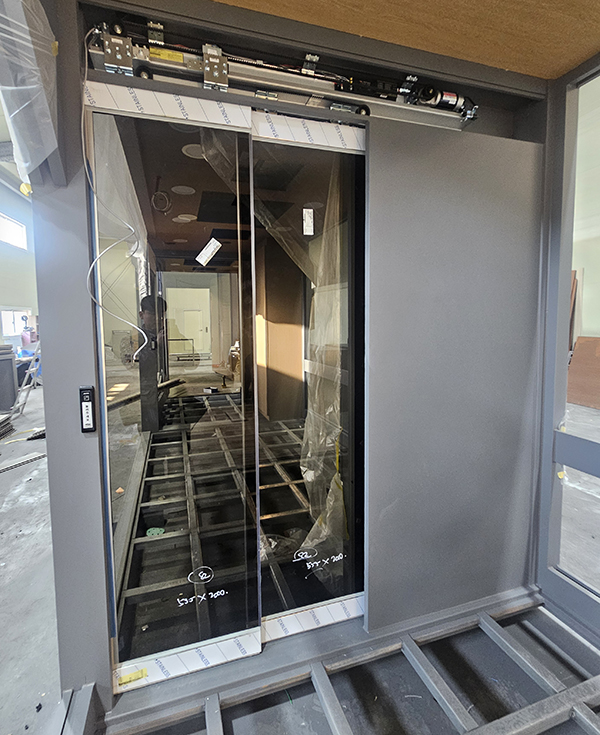 포천 지역 컨테이너 사무실 출입구에 이중 슬라이딩 자동문을 시공했습니다.