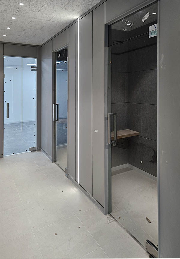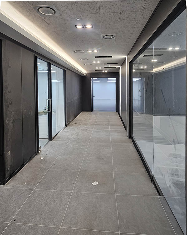 이번 현장은 명동·충무로 인접 상가 6층 내부를 전면 리뉴얼하며, 각 점포와 복도 공간을 유리로 구획해 시야를 확보하고, 출입 동선은 강화도어로 정리했습니다.