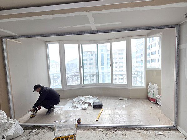 - 기존 샷시 철거 및 프레임 설치: 전문 작업자가 레이저 레벨기를 이용해 오차 없는 수평을 맞춥니다.